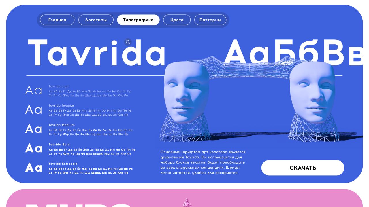 Второй вариант — Bebas Neue — еще наиболее контрастен фирменному шрифту. Он акцидентно вытянутый, прямоугольный и узкий на фоне округлого и мягкого Tavrida. Из-за этого шрифты хорошо сочетаются и создают более строгий, официальный стиль при взаимодействии по сравнению с Murs Gothic